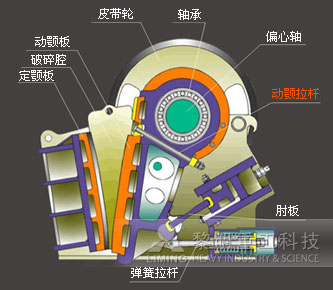 顎式破碎機主要由機架、偏心軸、大皮帶輪、飛輪、側護板、肘板、肘板后座、調隙螺桿、復位彈簧、固定顎板與活動顎板等組成,其中肘板還起到保險作用。
