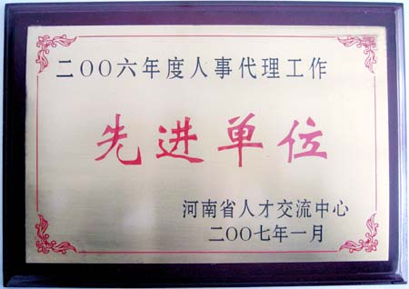 2007年1月28日,河南省人事代理先進(jìn)單位表彰大會在河南省“戰(zhàn)友大酒店”隆重召開,根據(jù)《關(guān)于表彰2006年度人事代理工作先進(jìn)單位和先進(jìn)工作才的決定》(豫人才發(fā)〔2007〕3號),我公司繼2004年度、2005年度兩次被評為“河南省人事代理先進(jìn)單位”之后,再獲此殊榮。公司人力資源部喬經(jīng)理等同志被表彰為先進(jìn)工作者。
