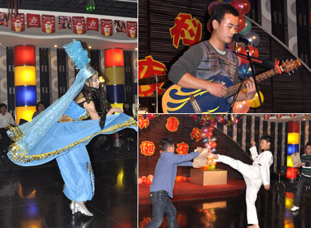 晚會在現代團體舞《快樂寶貝》激情歡快的節奏中拉開序幕。在隨后上演的眾多節目中,歌曲串燒、表演秀、神奇魔術、詼諧小品、武術表演等幽默勁爆節目給廣大員工帶來強烈的感官沖擊,現場觀眾情緒高漲、熱鬧歡騰;接下來,婉轉悠揚的笛子演奏、夢幻的藏族、新疆舞蹈,以及優雅歡快的爵士舞蹈又把晚會現場帶入另一個高雅唯美的情感世界。整場晚會,在全體參與人員的共同努力下,通過不同節奏的變換、不同主題的穿插,為全體同事呈現了一場豐富、豐厚、豐滿的文化藝術大餐。