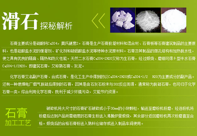 石膏主要成分是硫酸鈣CaSO4,莫氏硬度2。石膏是生產石膏膠凝材料和混合材、石膏板等石膏建筑制品的主要原料,也是硅酸鹽水泥的緩凝劑、礦化劑和硫鋁酸鹽水泥等特種水泥原材料。石膏及其制品的微孔結構和加熱脫水性,使之具有優良的隔音、隔熱和防火性能。天然二水石膏CaSO4.2H2O又稱為生石膏,經過煅燒、磨細可得β型半水石膏CaSO4.1/2H2O,即建筑石膏,又稱熟石膏、灰泥。