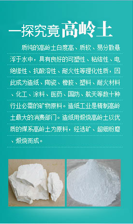 質純的高嶺土白度高、質軟、易分散懸浮于水中,具有良好的可塑性、粘結性、電絕緣性、抗酸溶性、耐火性等理化性質,因此成為造紙、陶瓷、橡膠、塑料、耐火材料、化工、涂料、醫藥、國防、航天等數十種行業的礦物原料。造紙工業是精制高嶺土大的消費部門。造紙用煅燒高嶺土以品質良好的煤系高嶺土為原料,經選礦、超細粉磨、煅燒而成。