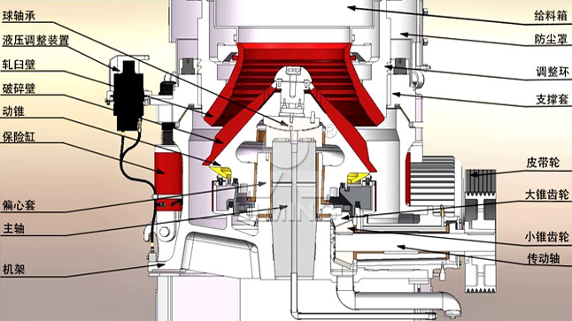 HPT液壓圓錐破碎機主要由機架部、支撐套部、調整環部、動錐部、偏心套部、傳動部和保險裝置部七大部件組成,主軸固定,電動機帶動傳動軸旋轉,傳動軸通過齒輪帶動偏心套繞主軸旋轉,再由偏心套帶動動錐部做偏心圓周擺動,從而實現連續的擠壓破碎石塊。